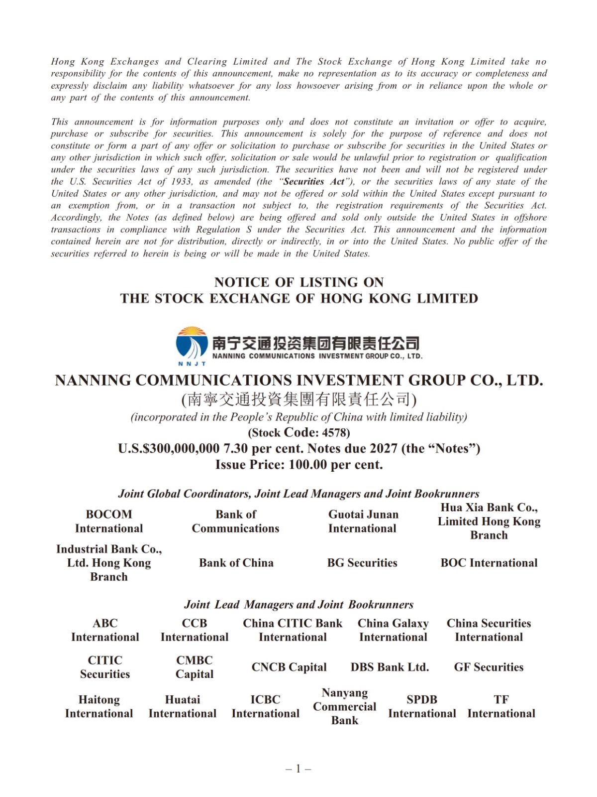 Publication of the Offering Circular - Nanning Communications Investment Group Co., Ltd.(调教 ) - U.S.$300,000,000 7.30 per cent. Notes due 2027