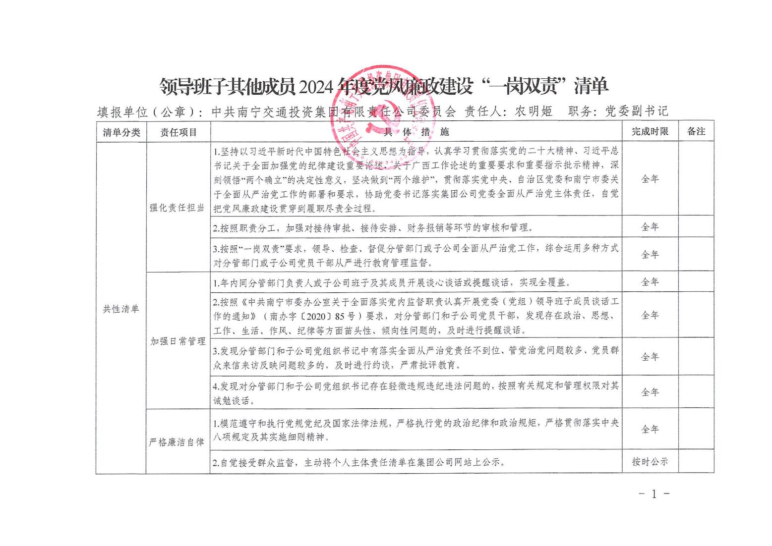 领导班子其他成员2024年度党风廉政建设“一岗双责”清单(一)