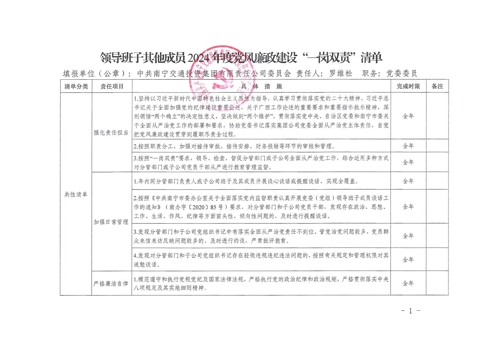 领导班子其他成员2024年度党风廉政建设“一岗双责”清单(四)