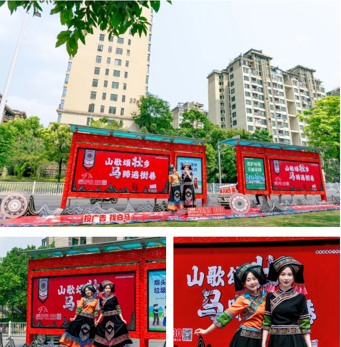 三月三,穿传统服饰过节必不可少。瞧,公交候车亭也穿上了节日的盛装,鲜艳的色彩、精美的图案,浓浓的民族风情,为城市增添了一道亮丽的风景,营造了浓厚的节日氛围。图为赛扬传媒公司员工身着传统服饰在公交候车亭旁合影。