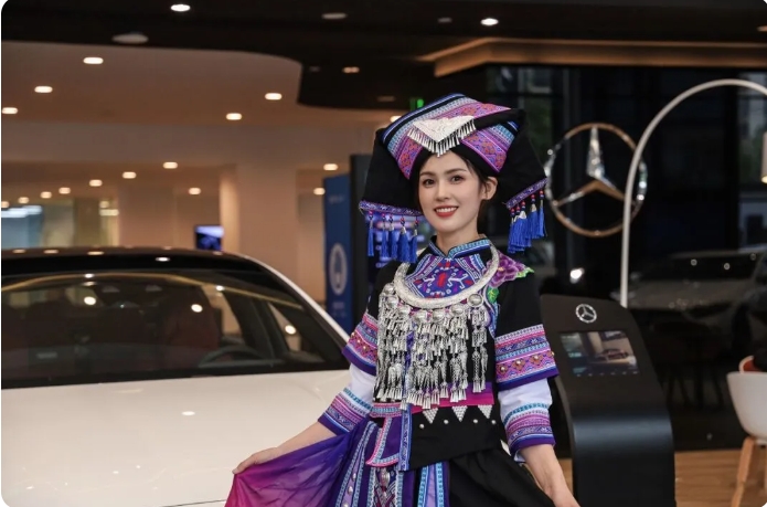 壮族的传统服饰衣裙颜色为蓝黑色,色泽鲜艳且不易褪色,既耐脏又耐穿,充分体现了壮族人民的智慧和文化,也寄托了壮族人民对美好生活的向往和追求。图为康城汽车集团冠星公司员工展示壮族服饰。