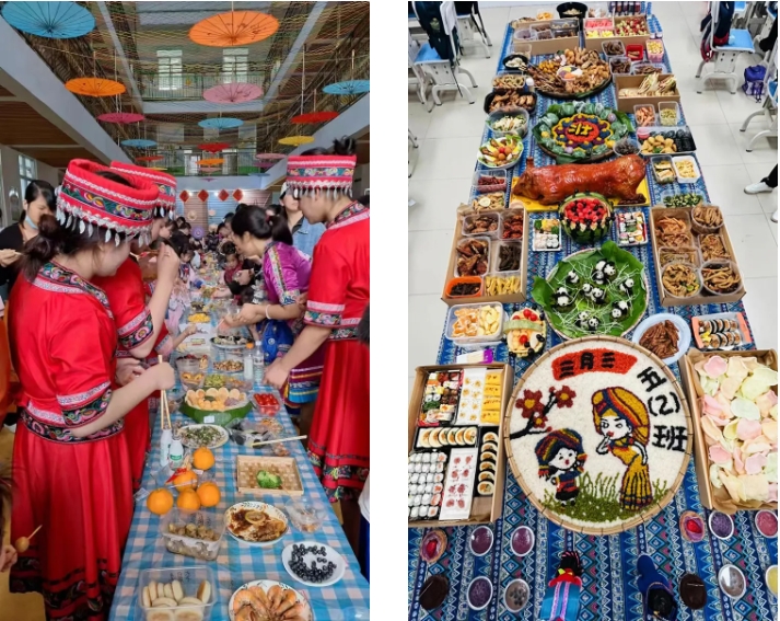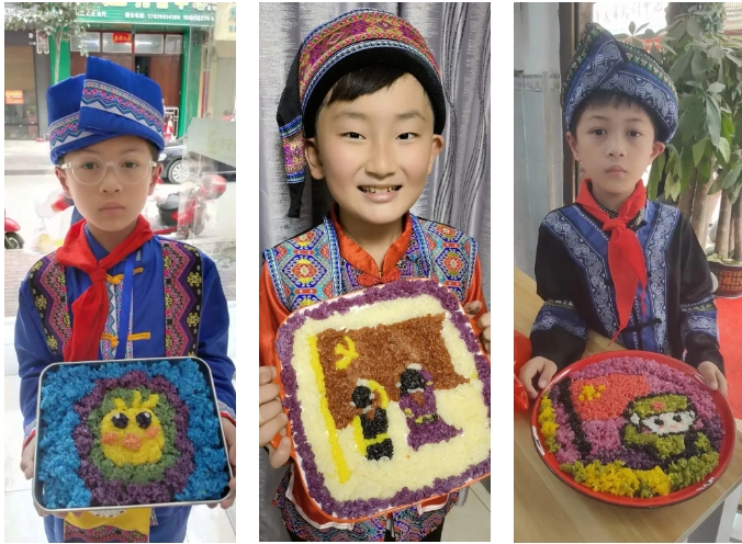 “长桌宴”又称合拢宴,是侗族、苗族、瑶族等多个民族的风俗习惯,常用于接亲嫁女、满月酒、村寨联谊等宴饮活动,代表最为隆重的待客礼俗,已有几千年历史。“长桌宴”上有壮族特色的五色糯米饭、艾叶糍粑、壮粽,苗族的传统佳肴,还有黎族的三色饭……一份份美食造型美观、色彩鲜艳、香味扑鼻。图为集团职工拍摄的孩子参加学校“三月三”活动。