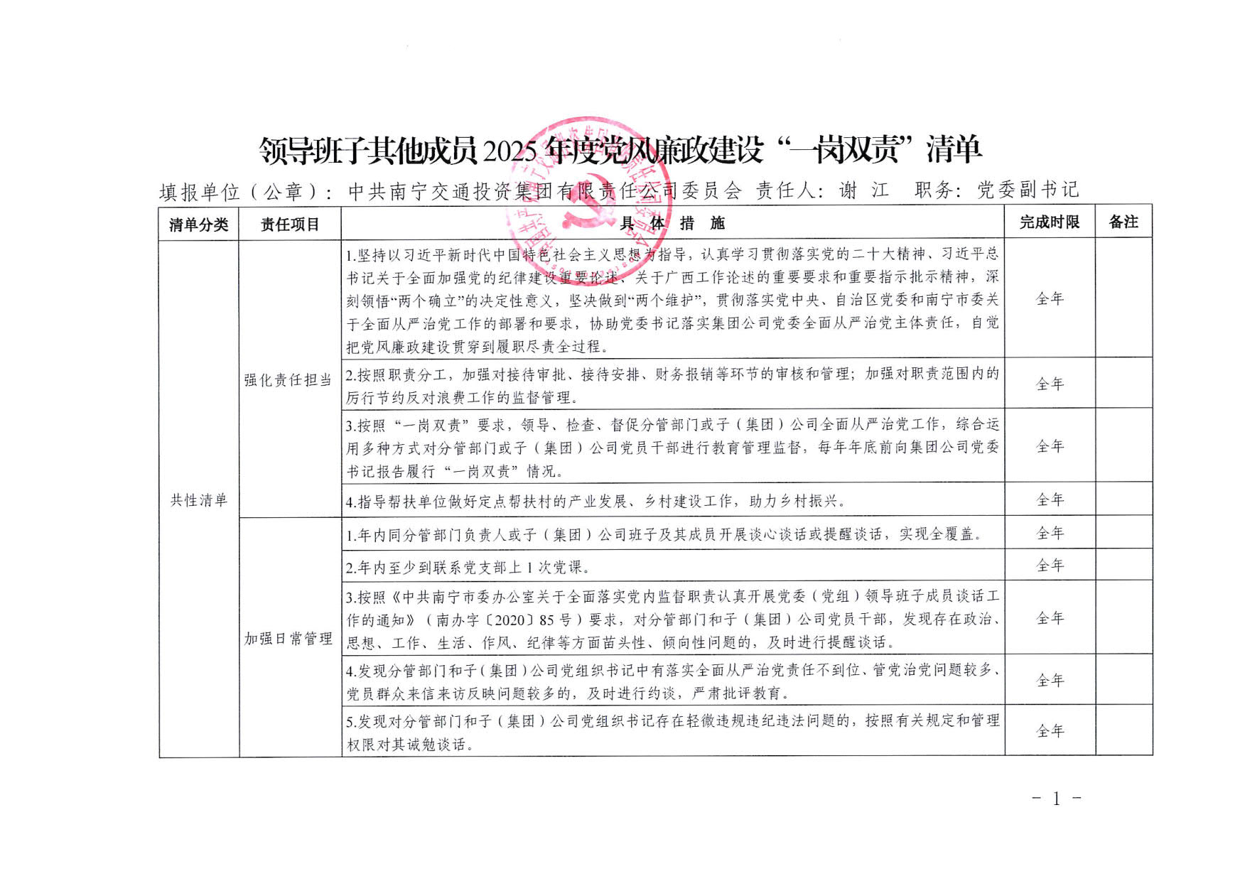 调教 领导班子其他成员2025年度党风廉政建设“一岗双责”清单(一)