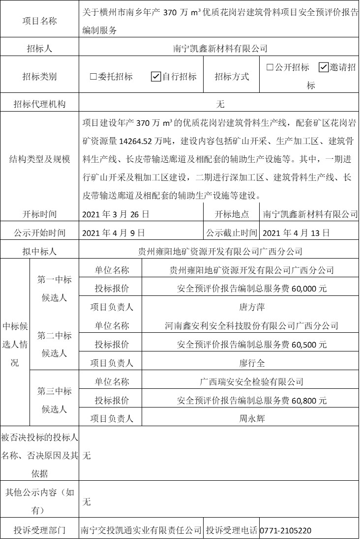 05-14关于横州市南乡年产370万m³优质花岗岩建筑骨料项目安全预评价报告编制服务中标候选人公示
