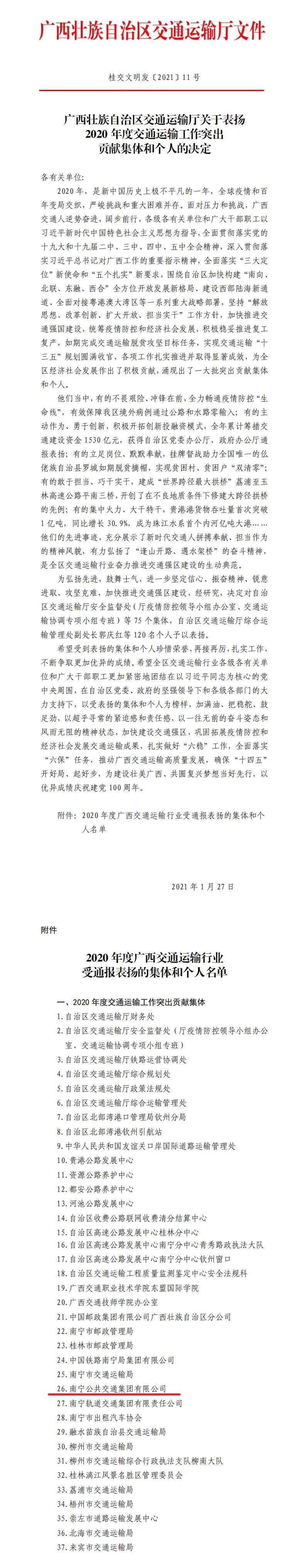 近日,调教 下属公交集团获“2020年度广西交通运输工作突出贡献集体”!
